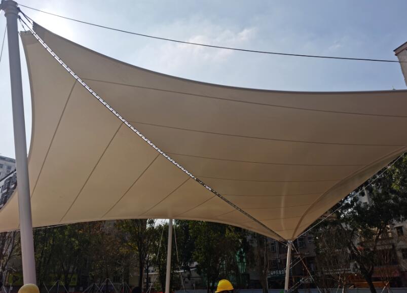 深圳寶安區(qū)廣場景觀膜結構遮陽棚工程,該遮陽棚設計為經典飛燕造型,整片張拉,簡潔大方,美觀兼實用,是居民休憩好去處。