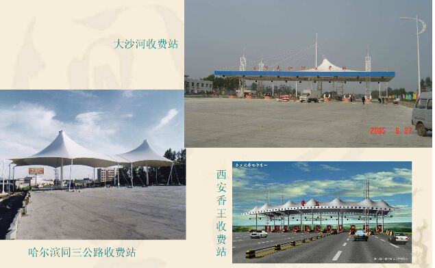 在我國隨著PTFE永久性膜材加工工藝的突破,也逐步為設(shè)計師們所應(yīng)用,如廣州白云機場候機大廳、西安機場入口、秦沈快速鐵路、葫蘆島站臺雨棚等等。此外,膜結(jié)構(gòu)在交通設(shè)施方面的應(yīng)用還包括加油站和公路收費站雨篷,大部分采用PVC涂層材料。建設(shè)火車站候車室及候機大廳一定要使用PTFE材料(永久性膜材),而建設(shè)公路收費站雨篷使用PVDF自潔性能較好的材料。