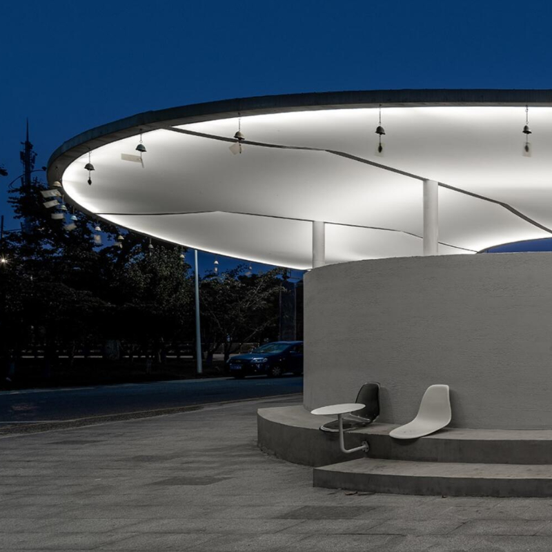 兩面的墻的設(shè)計(jì)遮擋了停車場(chǎng)的視線,也加強(qiáng)了景區(qū)入口的流線。傘狀的結(jié)構(gòu),不僅為了強(qiáng)化屋頂在環(huán)境中的辨識(shí)度,同時(shí)也能讓屋頂能夠輕盈的“飄浮”在墻上。墻面與屋頂?shù)姆蛛x也減少了長(zhǎng)江邊空氣對(duì)流造成的風(fēng)壓。材料上,我們采用了PTFE可透光的膜材料,為夜間活動(dòng)的人群照亮了空間。
