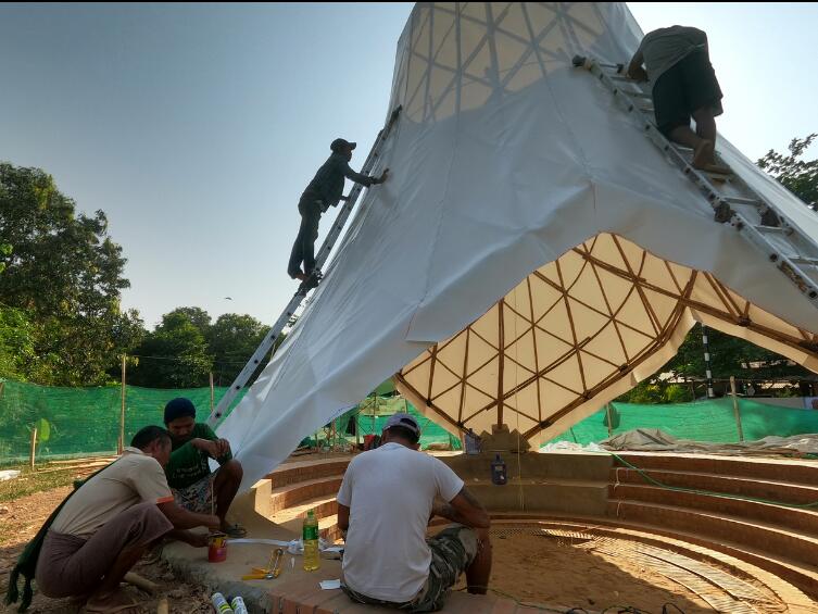 整個(gè)結(jié)構(gòu)由竹子和膜布建成,龍竹(Dendrocalamus giganteus )用于框架,銳藥竹(Oxytenanthera albocialiata Munro)用于弧形元素,而支撐和屋頂梁則采用泰竹(Thysostachys siamensis ), 屋頂覆蓋白色膜布,在∞形狀的兩個(gè)開(kāi)口內(nèi)是場(chǎng)地的既有樹(shù)木和座位空間,供教師休息的同時(shí)能夠隨時(shí)視察孩子們的情況。