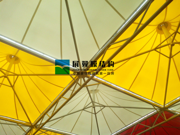 蘭州金牛街膜結(jié)構(gòu)工程全系列包括膜結(jié)構(gòu)天井、膜結(jié)構(gòu)屋頂遮陽(yáng)棚、膜結(jié)構(gòu)天橋通道遮陽(yáng)棚、啤酒屋膜結(jié)構(gòu)屋頂、特殊膜材玻璃房等等、工程全部采用彩色膜材搭配建造,造型設(shè)計(jì)別出心裁。這些張拉膜建筑不但具備強(qiáng)大的實(shí)用功能,同時(shí)也成為了商業(yè)街一大觀(guān)賞亮點(diǎn)。